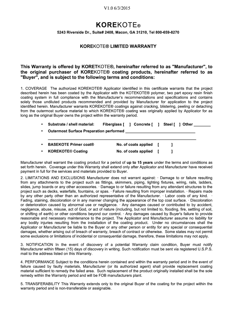 V1.0 6/3/2015KOREKOTE 5243 Riverside Dr., Suite# 2408, Macon, GA 31210, Tel 8006598270KOREKOTE LIMITED WARRANTYThis Warranty is offered by FORETASTE, hereinafter referred to as “Manufacturer “,