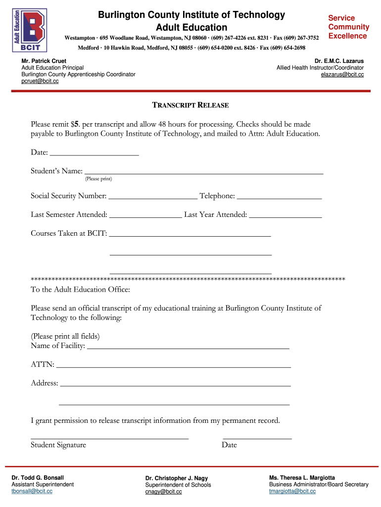 Burlington County Institute of Technology Adult Education Westampton 695 Woodland Road, Westampton, NJ 08060 (609) 2674226 ext. 8231 Fax (609) 2673752Service Community Excellence Medford 10 Hawkins
