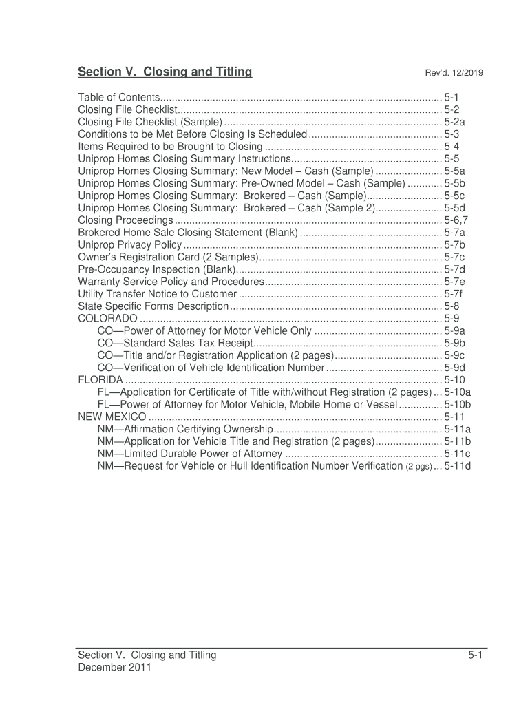Section V. Closing and TitlingRevd. 12/2019Table of Contents................................................................................................. 51 Closing File Checklist...........................................................................................