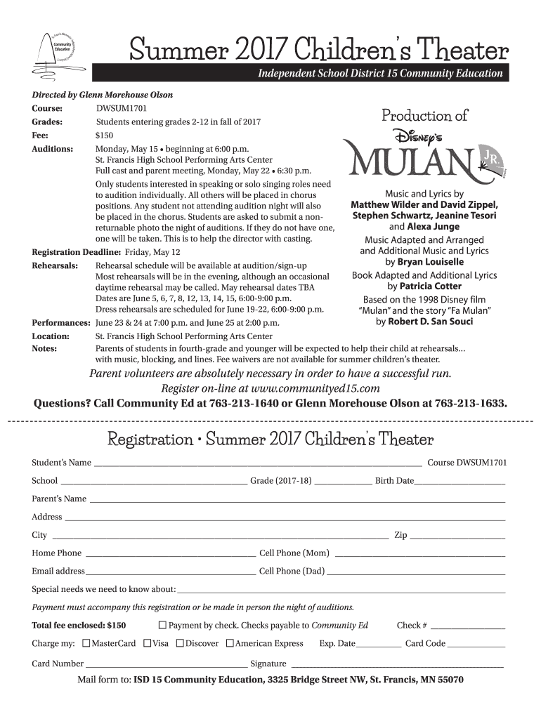 Summer 2017 Children's Theater Independent School District 15 Community Education Directed by Glenn Morehouse Olson Course:DWSUM1701 Grades:Students entering grades 212 in fall of 2017 Fee: $150 Auditions:Monday,
