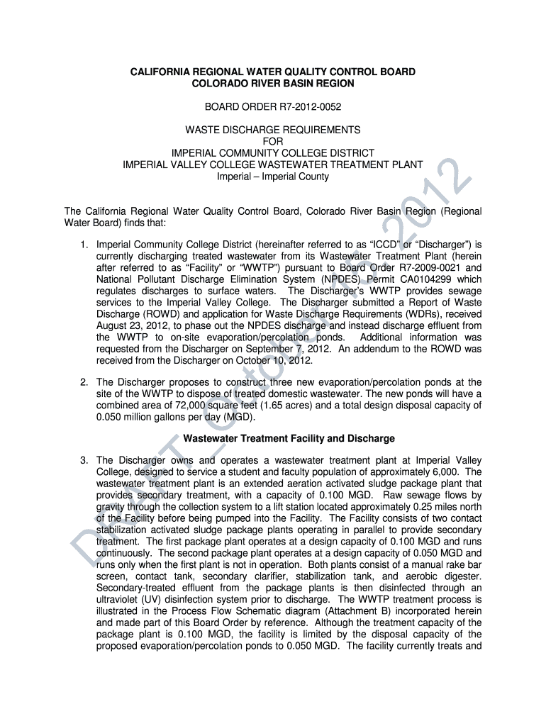 CALIFORNIA REGIONAL WATER QUALITY CONTROL BOARD COLORADO RIVER BASIN REGION BOARD ORDER R720120052 WASTE DISCHARGE REQUIREMENTS FOR IMPERIAL COMMUNITY COLLEGE DISTRICT IMPERIAL VALLEY COLLEGE WASTEWATER