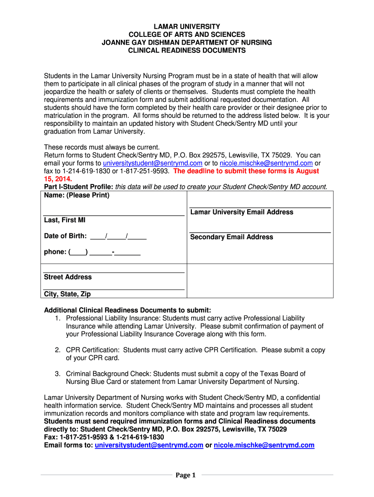 CLINICAL READINESS DOCUMENTSStudents in the Lamar University Nursing Program must be in a state of health that