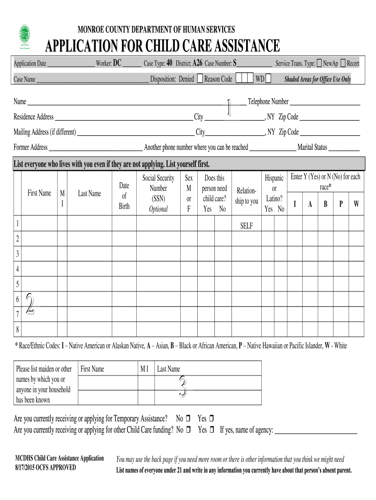 MONROE COUNTY DEPARTMENT OF HUMAN SERVICESAPPLICATION FOR CHILD CARE ASSISTANCE Application Date Worker: DC Case Type: 40 District: A26 Case Number: S Service Trans. Type: Case Name Disposition: DeniedReason