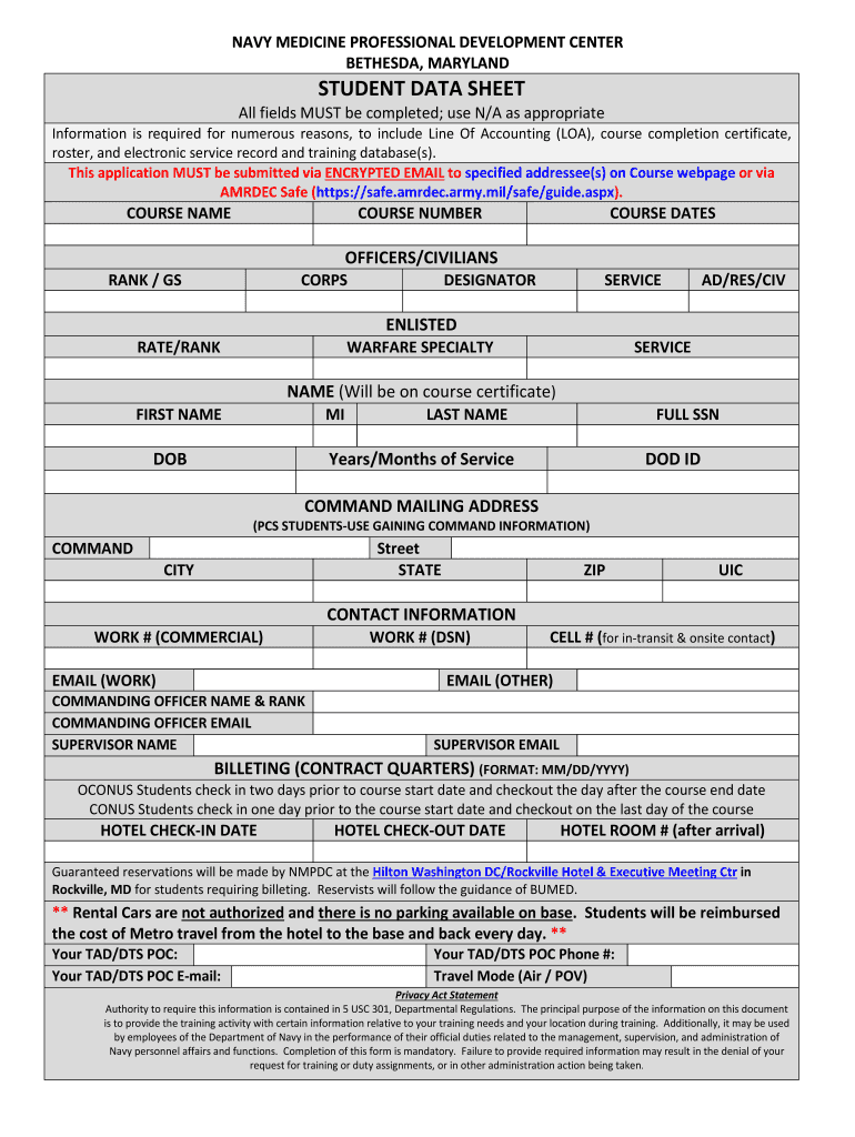 BETHESDA, MARYLANDSTUDENT DATA Shall field MUST be completed; use N/A as appropriateInformation is required for numerous reasons, to include Line Of Accounting