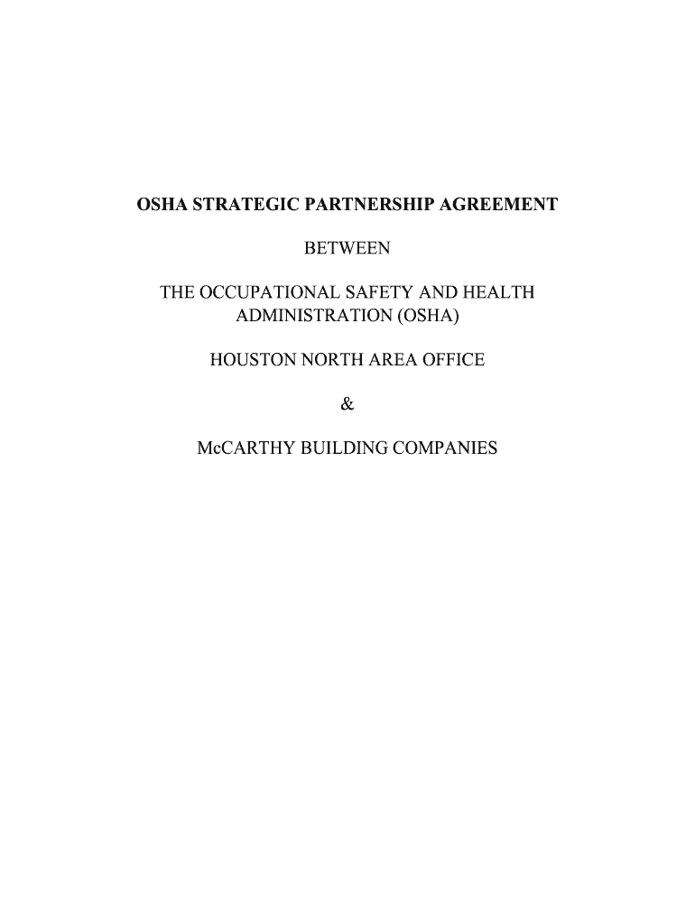 OSHA STRATEGIC PARTNERSHIP AGREEMENT BETWEEN THE OCCUPATIONAL SAFETY AND HEALTH ADMINISTRATION (OSHA) HOUSTON NORTH AREA OFFICE & McCarthy BUILDING COMPANIONABLE OF CONTENTS I.IDENTIFICATION OF PARTNERS