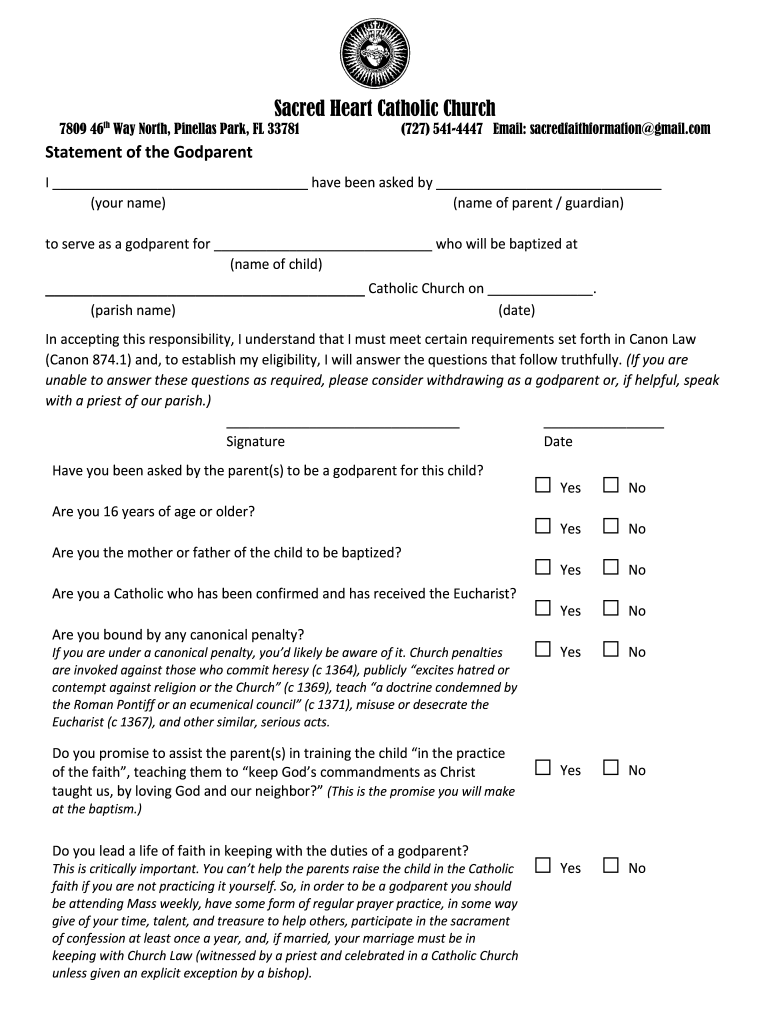 Sacred Heart Catholic Church 7809 46th Way North, Pinellas Park, FL 33781(727) 5414447 Email: sacredfaithformation Gmail. Statement of the Godparent I have been asked by (your name) (name of parent
