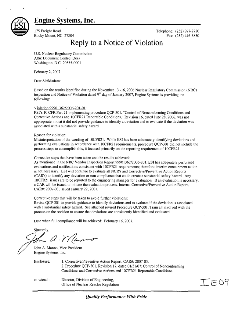 Engine Systems Inc reply is a formal response provided by the company regarding a specific matter or issue.