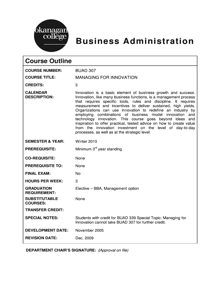 Business Administration Course Outline COURSE NUMBER: BAD 307 COURSE TITLE: MANAGING FOR INNOVATION CREDITS: 3 CALENDAR DESCRIPTION: Innovation is a basic element of business growth and success. Innovation,
