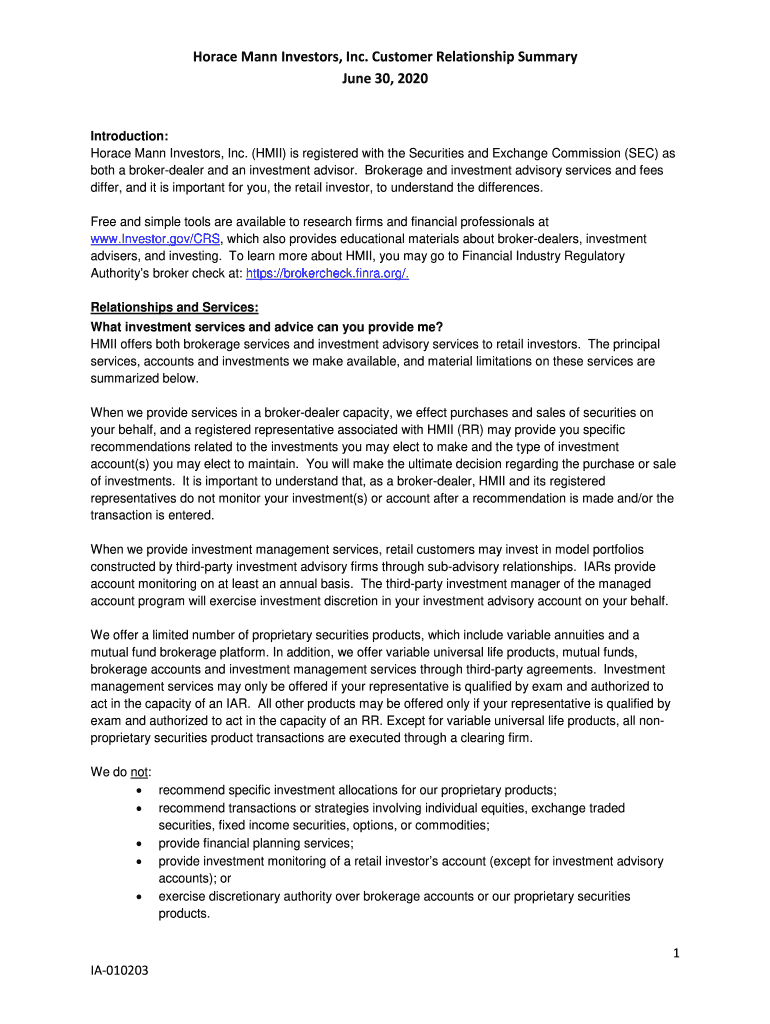 Horace Mann Investors, Inc. Customer Relationship Summary