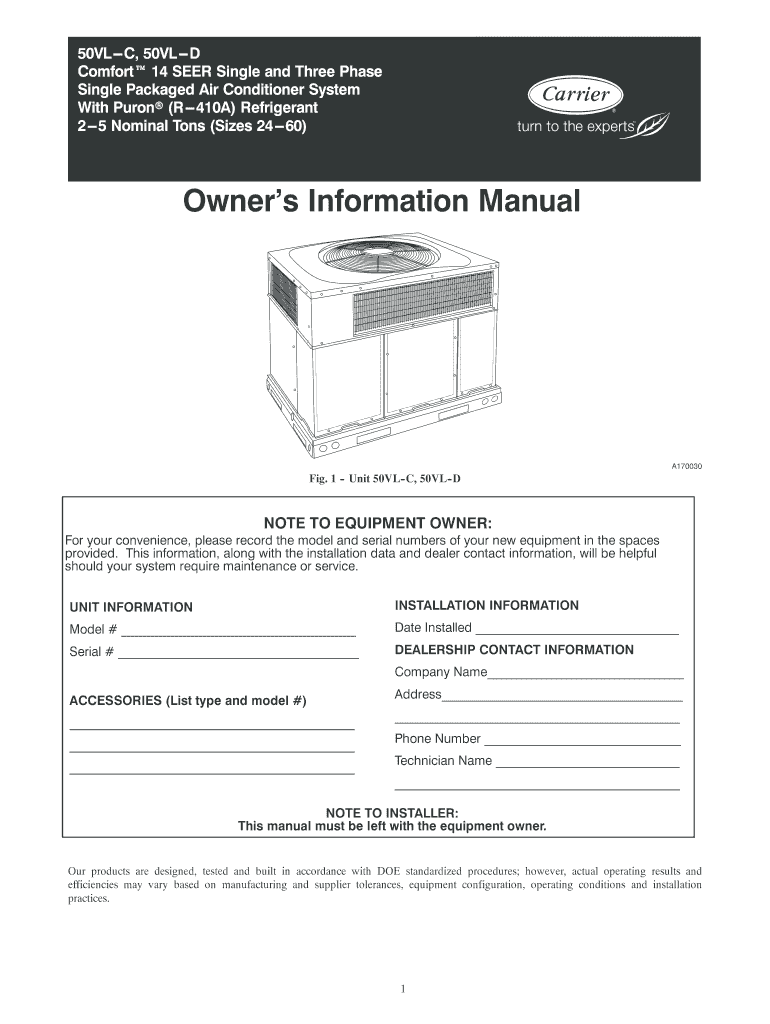 50VLC, 50VLD Comfort 14 SEER Single and Three Phase Single Packaged Air Conditioner System With Prone (R410A) Refrigerant 25 Nominal Tons (Sizes 2460)Owners Information ManualA170030Fig. 1 Unit 50VLC,