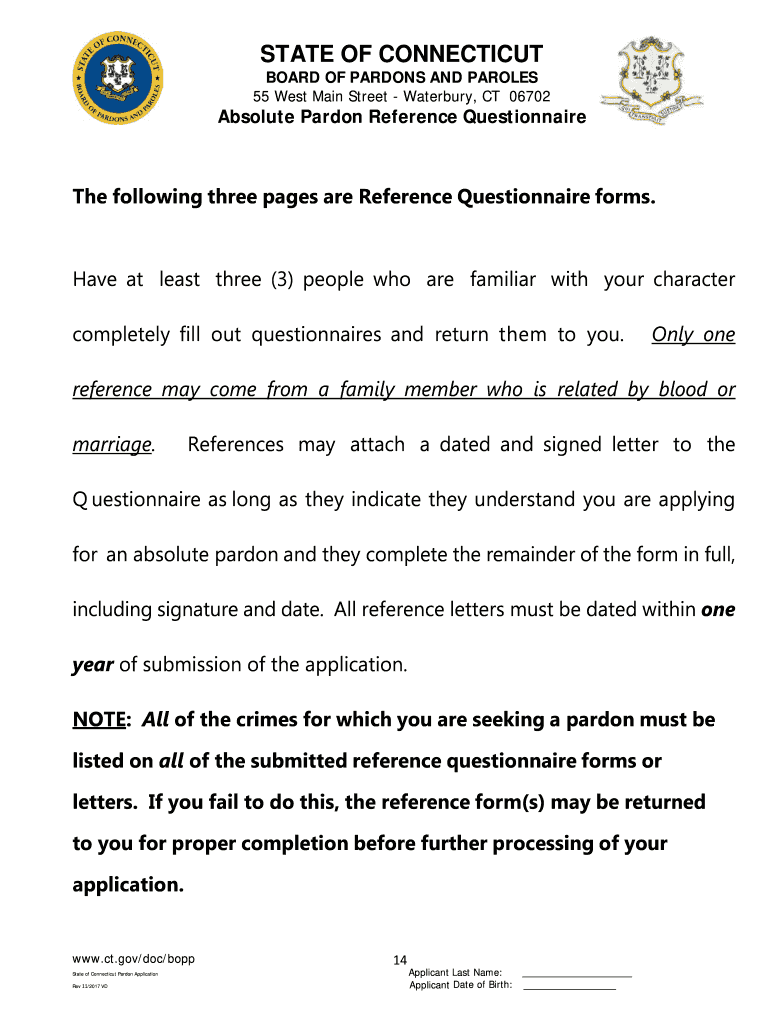 STATE OF CONNECTICUTBOARD OF PARDONS AND PAROLES 55 West Main Street Waterbury, CT 06702Absolute Pardon Reference Questionnaire following three pages are Reference Questionnaire forms. Have at least