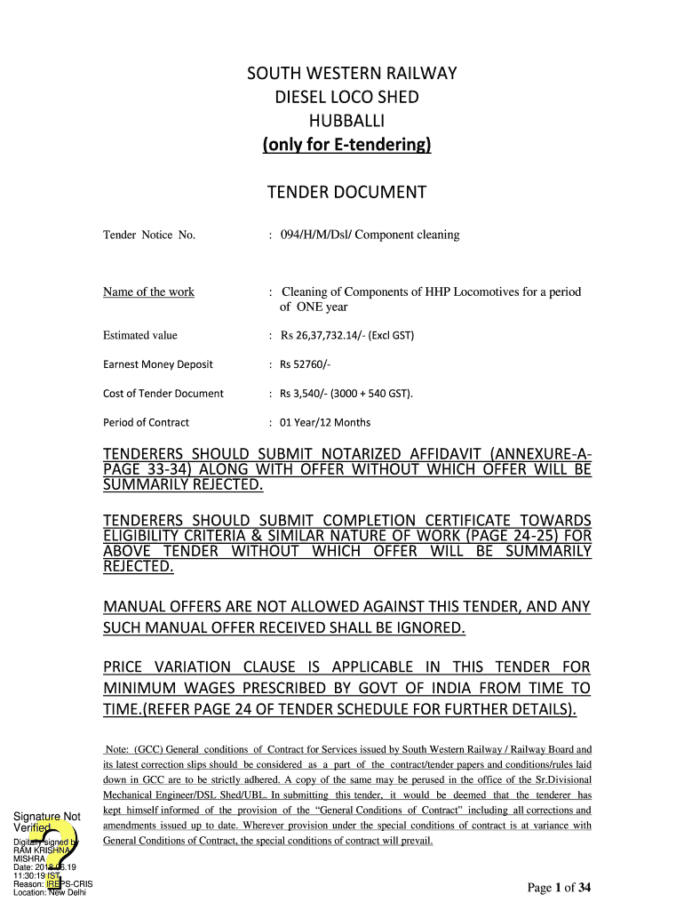 Tender Notice No.: 094/H/M/DSL/ Component cleaningName of the work: Cleaning of Components of HIP Locomotives for