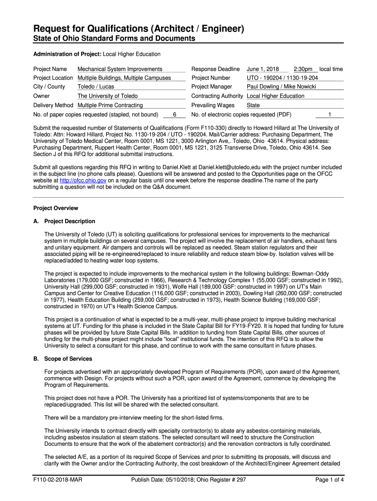 Request for Qualifications (Architect / Engineer) State of Ohio Standard Forms and Documents Administration of Project: Local Higher Education Project Non-response Deadline June 1, 2018Project Location