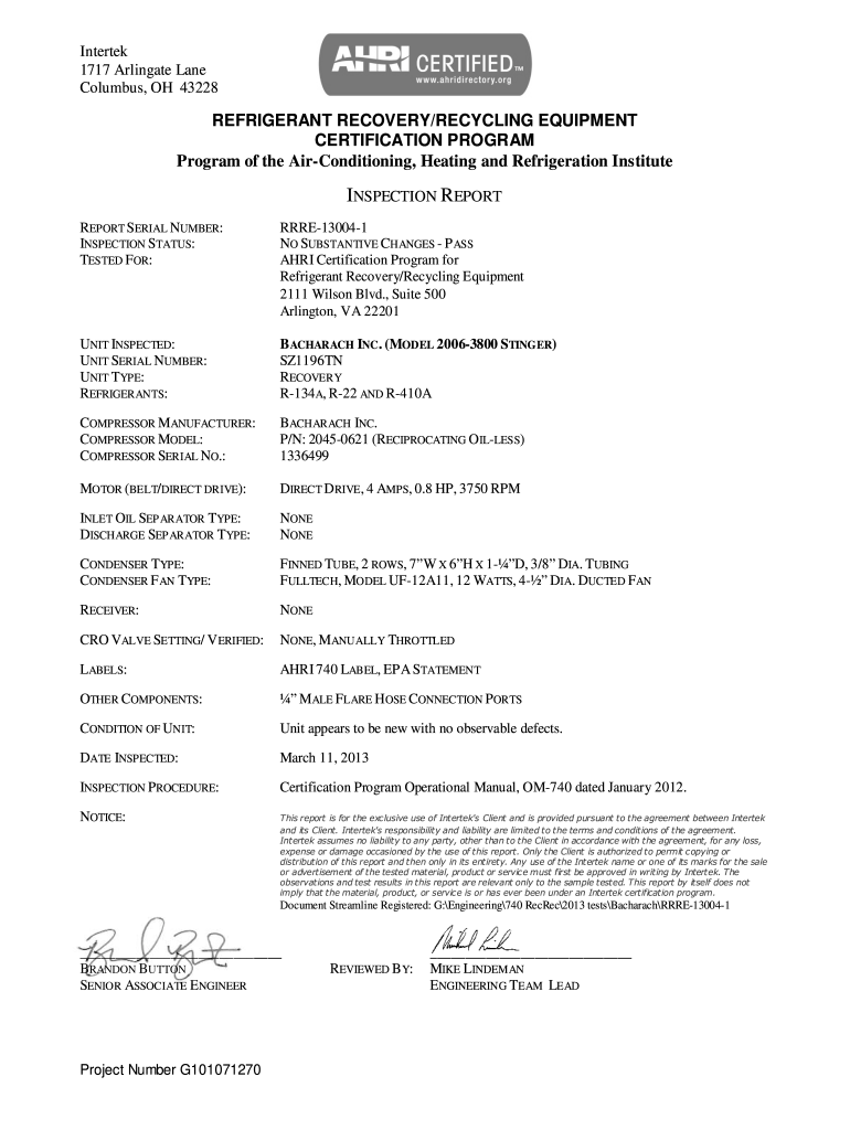 Internet 1717 Frigate Lane Columbus, OH 43228REFRIGERANT RECOVERY/RECYCLING EQUIPMENT CERTIFICATION PROGRAM of the Air-conditioning, Heating and Refrigeration InstituteINSPECTION REPORT SERIAL NUMBER: