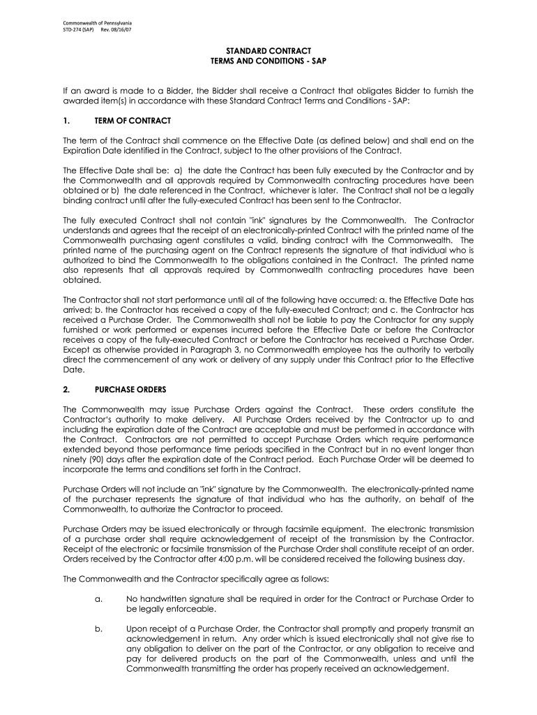 Commonwealth of Pennsylvania STD274 (SAP) Rev. 08/16/07STANDARD CONTRACT TERMS AND CONDITIONS SAP If an award is made to a Bidder, the Bidder shall receive a Contract that obligates Bidder to furnish