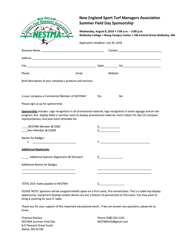 NewEnglandSportTurfManagersAssociation SummerFieldDaySponsorship Wednesday,August8,20187:00a.m.3:00p.m. WellesleyCollegeWangCampusCenter106CentralStreetWellesley,MA ApplicationDeadline:July20,2018