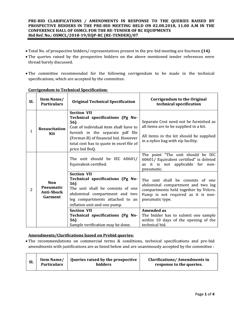 PREBID CLARIFICATIONS / AMENDMENTS IN RESPONSE TO THE QUERIES RAISED BY PROSPECTIVE BIDDERS IN THE PREBID MEETING HELD ON 02.08.2018, 11.00 A. M IN THE CONFERENCE HALL OF OS MCL FOR THE PRETENDER