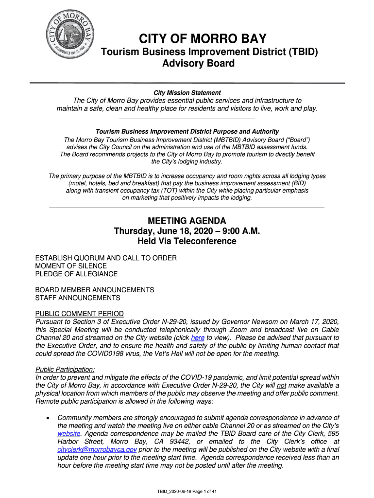 CITY OF MORO BAY Tourism Business Improvement District (BID) Advisory Board City Mission Statement City of Moro Bay provides essential public services and infrastructure to maintain a safe, clean