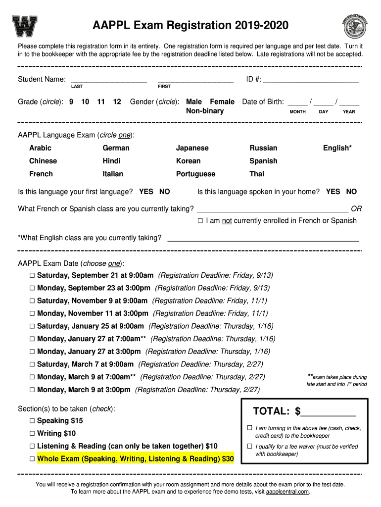 AA PPL Exam Registration 20192020 Please complete this registration form in its entirety. One registration form is required per language and per test date. Turn it in to the bookkeeper with the appropriate