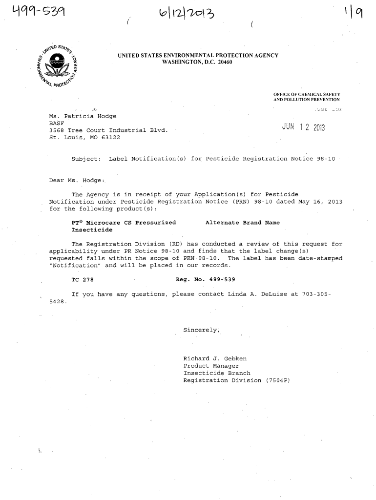 UNITED STATES ENVIRONMENTAL PROTECTION AGENCY WASHINGTON, D.C. 20460OFFICE OF CHEMICAL SAFETY AND POLLUTION PREVENTION Ms. Patricia Hodge Basis A3568 Tree Court Industrial Blvd. St. Louis, MO 63122Subject:1