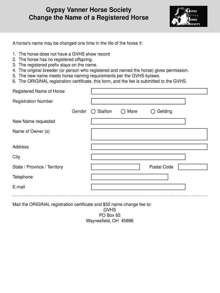 Change the Name of a Registered Horse\'s name may be changed one time in the life of the horse if:
