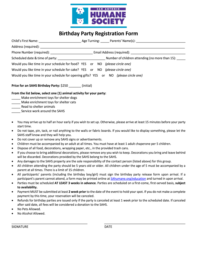 Birthday Party Registration Form Child's First Name: Age Turning: Parents Name(s): Address (required): Phone Number (required): Email Address (required): Scheduled date & time of party: Number of