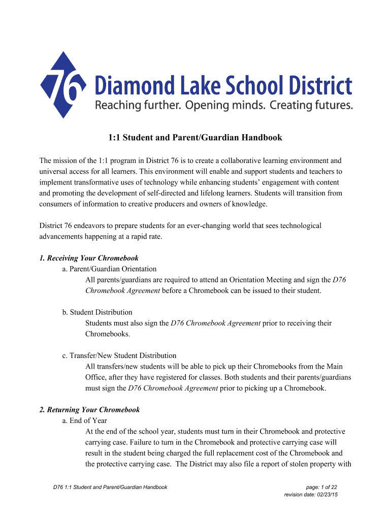 1:1StudentandParent/GuardianHandbook Themissionofthe1:1programinDistrict76istocreateacollaborativelearningenvironmentand universalaccessforalllearners. Thisenvironmentwillenableandsupportstudentsandteachersto