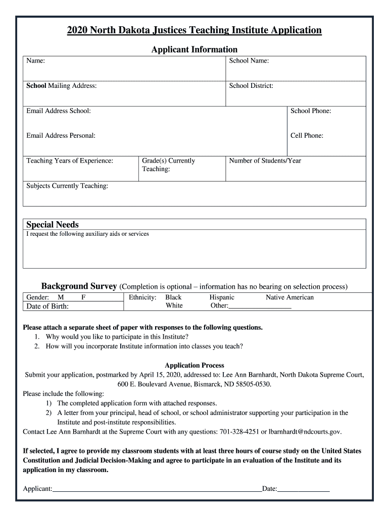 2020 North Dakota Justices Teaching Institute Application Applicant Information Name:School Name:School Mailing Address:School District:Email Address School:School Phone:Email Address Personal:Cell