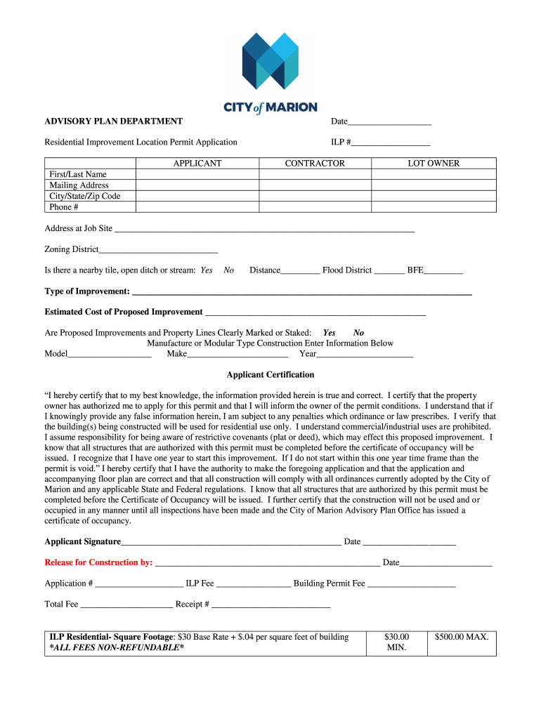 ADVISORY PLAN Departmental Residential Improvement Location Permit Application ILP # APPLICANTCONTRACTORLOT Orneriest/Last Name Mailing Address City/State/Zip Code Phone # Address at Job Site Zoning