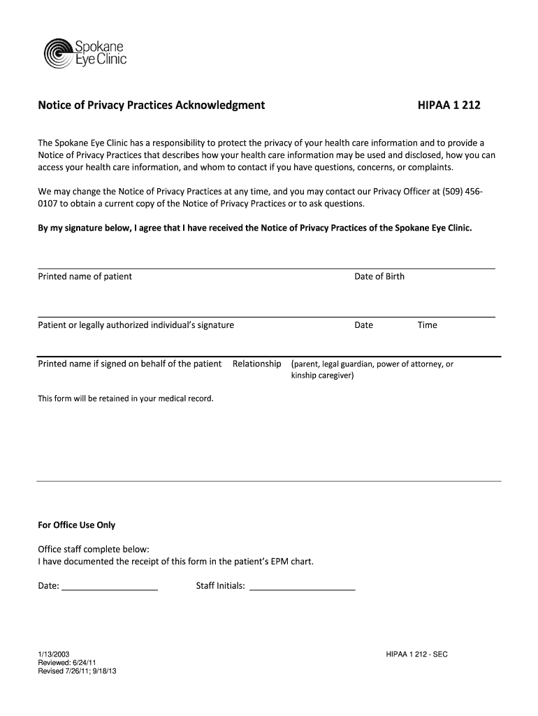 Notice of Privacy Practices AcknowledgmentHIPAA 1 212The Spokane Eye Clinic has a responsibility to protect the privacy of your health care information and to provide a