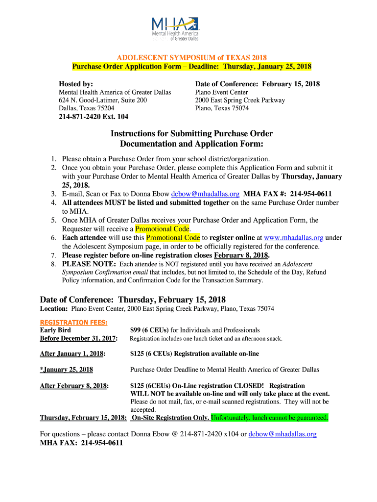 ADOLESCENT SYMPOSIUM of TEXAS 2018 Purchase Order Application Form Deadline: Thursday, January 25, 2018, Hosted by:Date of Conference: February 15, 2018Mental Health America of Greater Dallas 624