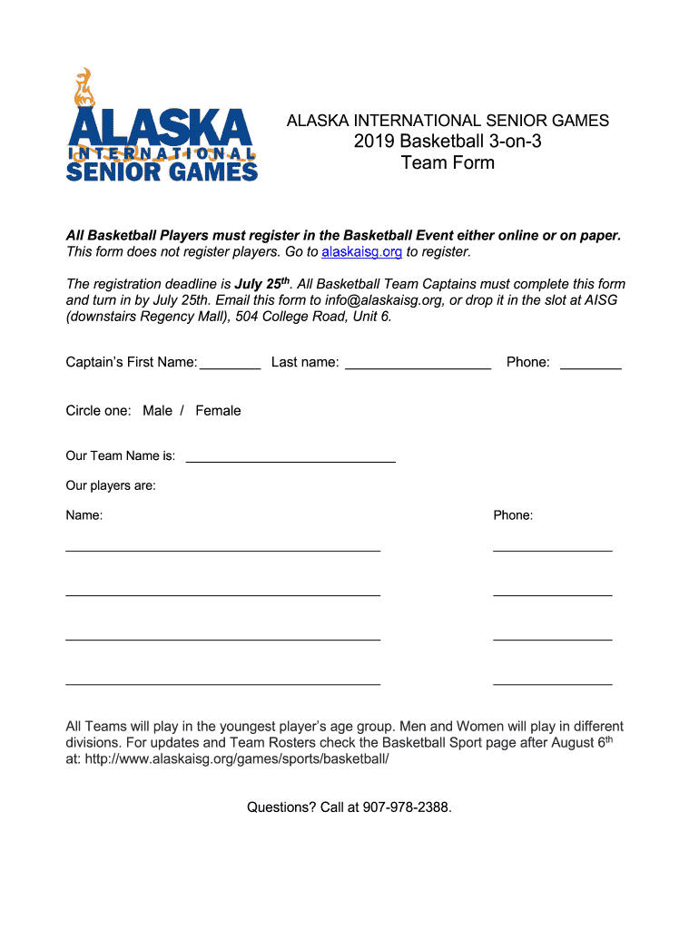 ALASKA INTERNATIONAL SENIOR GAMES2019 Basketball 3on3 Team Formal Basketball Players must register in the Basketball Event either online or on paper. This form does not register players. Go to Alaskans.org