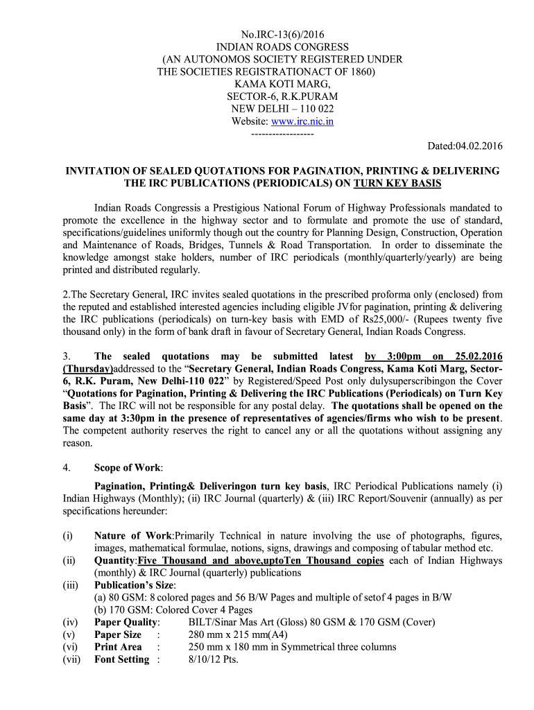 No.IRC13(6)/2016 INDIAN ROADS CONGRESS (AN AUTONOMOUS SOCIETY REGISTERED UNDER THE SOCIETIES REGISTRATION ACT OF 1860) KAMA KOI MARY, SECTOR6, R.K.PURIM NEW DELHI 110 022 Website: www.irc.nic.in Dated:04.02.2016