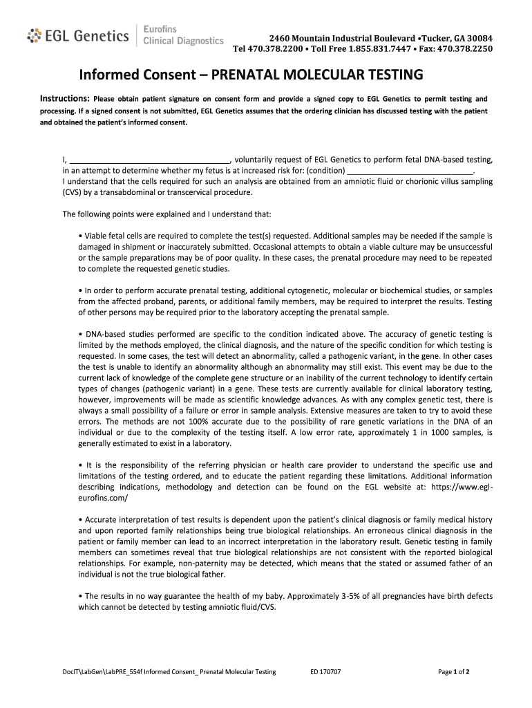 2460 Mountain Industrial Boulevard Tucker, GA 30084 Tel 470.378.2200 Toll Free 1.855.831.7447 Fax: 470.378.2250Informed Consent PRENATAL MOLECULAR TESTING Instructions: Please obtain patient signature