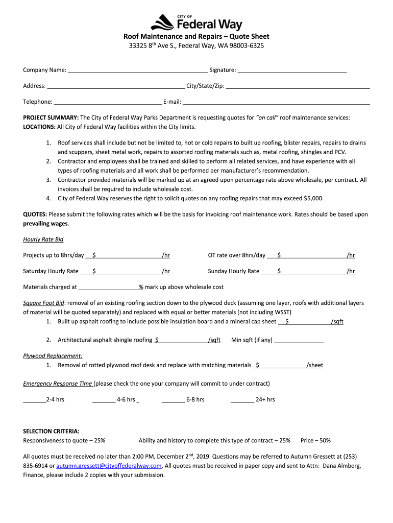 Roof Maintenance and Repairs Quote Sheet 33325 8th Ave S., Federal Way, WA 980036325 Company Name:Signature:Address:City/State/Zip:Telephone:Email:PROJECT SUMMARY: The City of Federal Way Parks Department