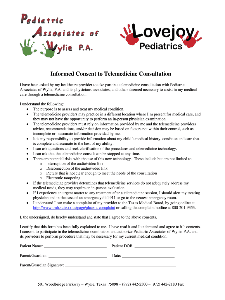 Informed Consent to Telemedicine Consultation I have been asked by my healthcare provider to take part in a telemedicine consultation with Pediatric Associates of Wylie, P.A. and its physicians, associates,