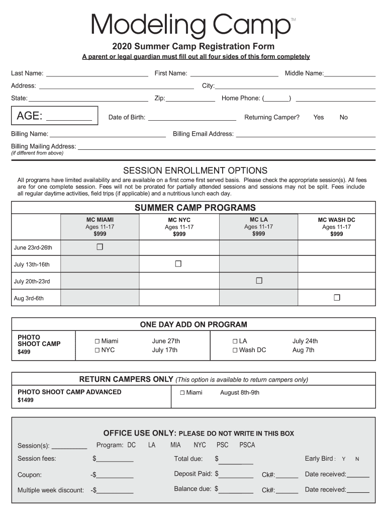 Modeling Camp TMA parent or legal guardian must fill out all four sides of this form completely A parent or legal guardian must fill out all four sides of this form completely Last Name: Last Name:2020