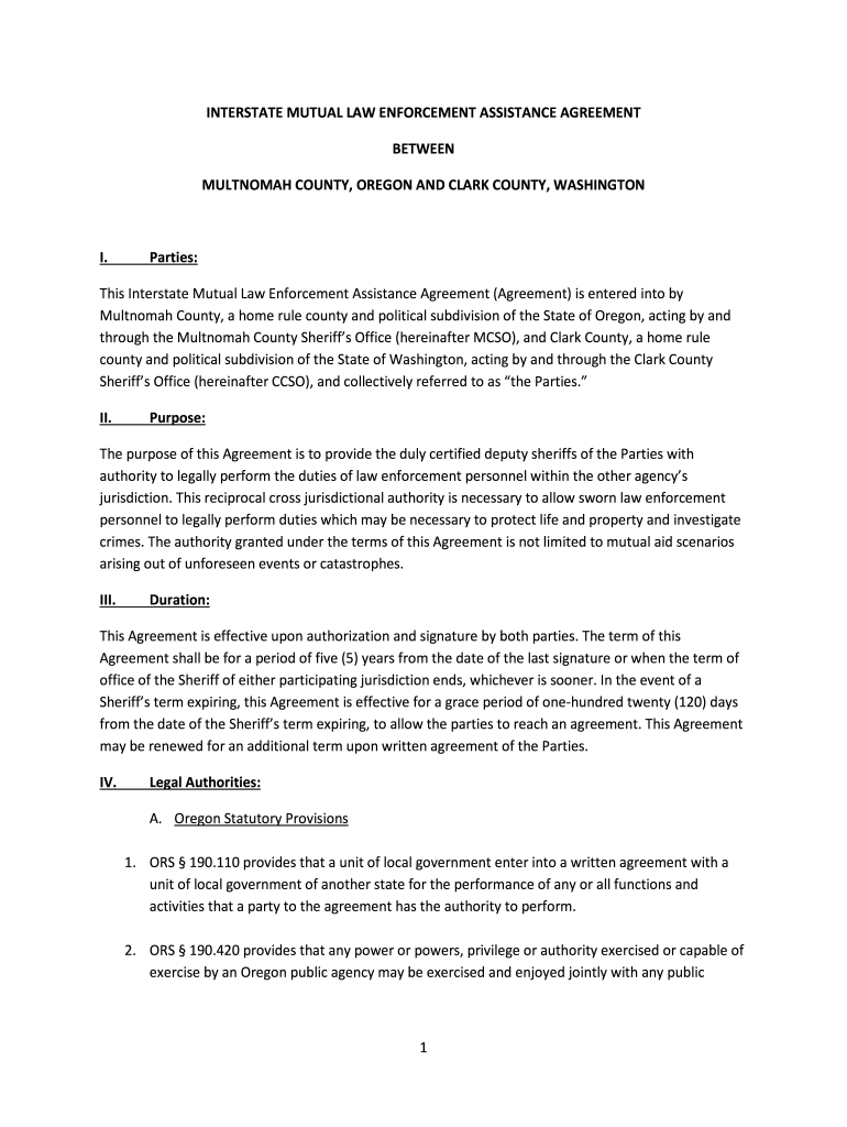 MULTNOMAH COUNTY, OREGON AND CLARK COUNTY, WASHINGTON. Parties:This Interstate Mutual Law Enforcement Assistance Agreement (Agreement)