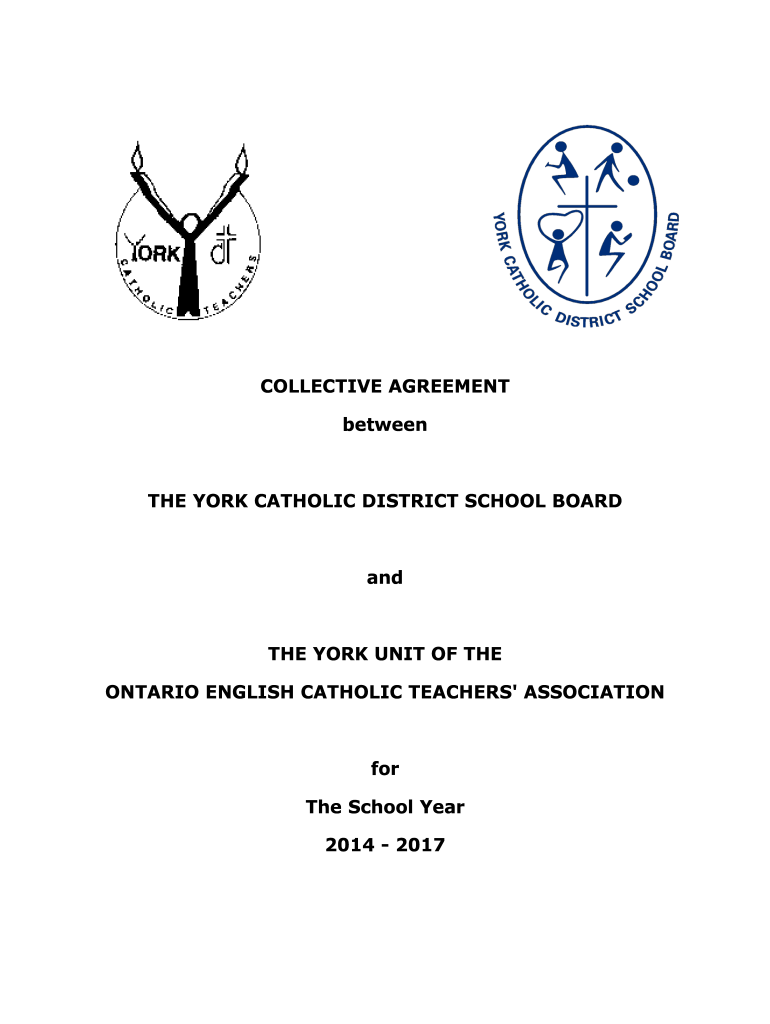 COLLECTIVE AGREEMENT between YORK CATHOLIC DISTRICT SCHOOL BOARDandTHE YORK UNIT OF THE ONTARIO ENGLISH CATHOLIC TEACHERS ASSOCIATION for The School Year 2014 2017Table of Contents PART A (Central