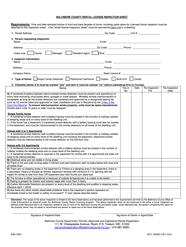 BALTIMORE COUNTY RENTAL LICENSE INSPECTION SHEETRequirements: Time and date stamped photos of front and back facades of home, including yards taken by Licensed Home Inspector must be attached to this