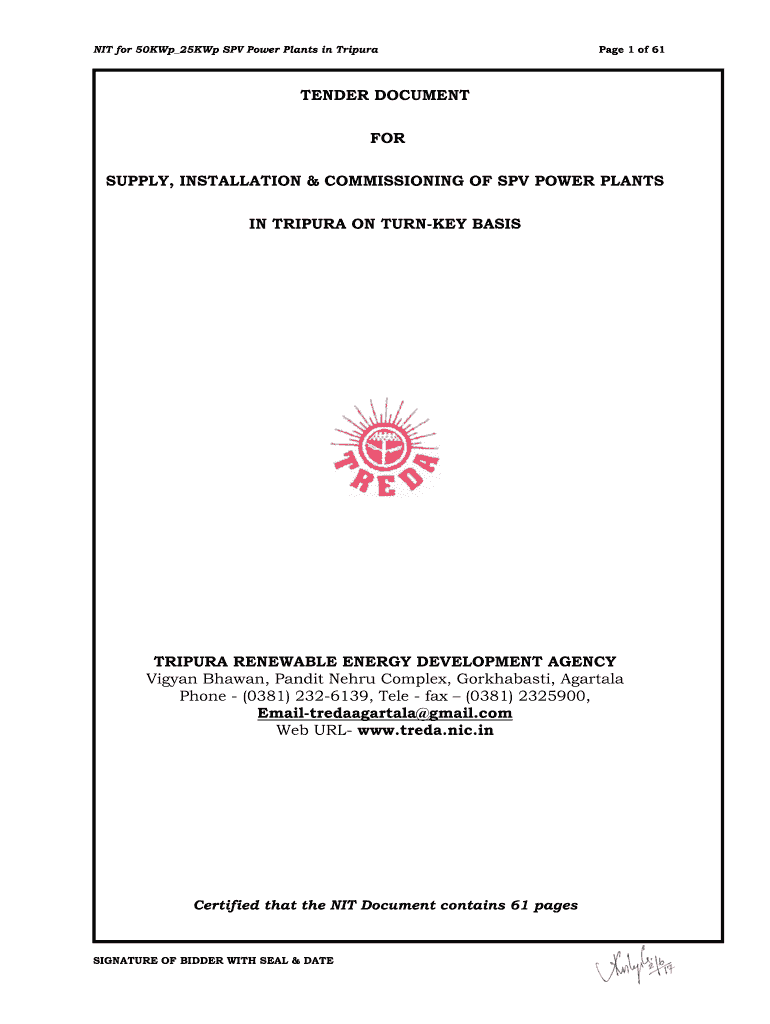 NIT for 50KWp 25KWp SPV Power Plants in TripuraPage 1 of 61TENDER DOCUMENT FOR SUPPLY, INSTALLATION & COMMISSIONING OF SPV POWER PLANTS IN TRIPURA ON TURNKEY BASISTRIPURA RENEWABLE ENERGY DEVELOPMENT