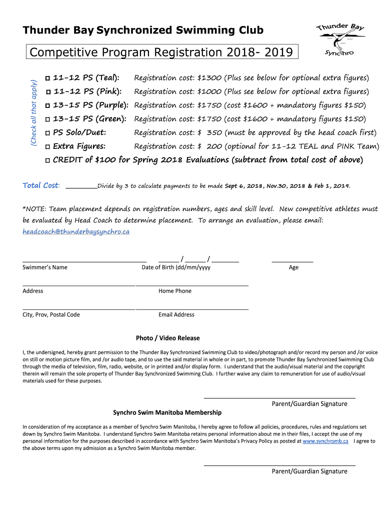 Thunder Bay Synchronized Swimming Club(Check all that apply)Competitive Program Registration 2018 2019 1 1112 PS (Teal):Registration cost: $1300 (Plus see below for optional extra figures) 1112 PS