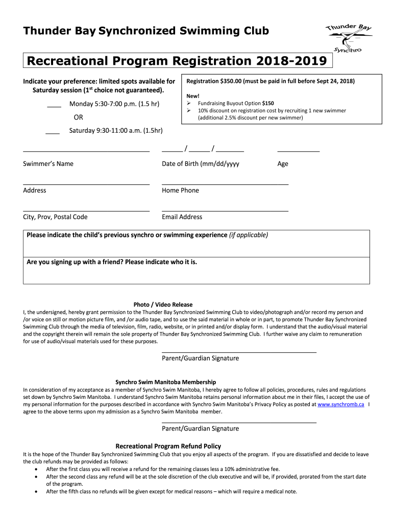 Thunder Bay Synchronized Swimming ClubRecreational Program Registration 20182019 Indicate your preference: limited spots available for Saturday session (1st choice not guaranteed). Monday 5:307:00
