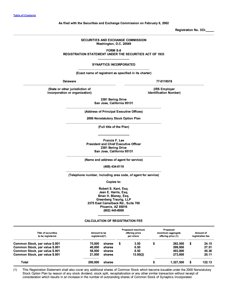 Table of Contents As filed with the Securities and Exchange Commission on February 6, 2002, Registration No. 333 SECURITIES AND EXCHANGE COMMISSION Washington, D.C. 20549 FORM S8 REGISTRATION STATEMENT