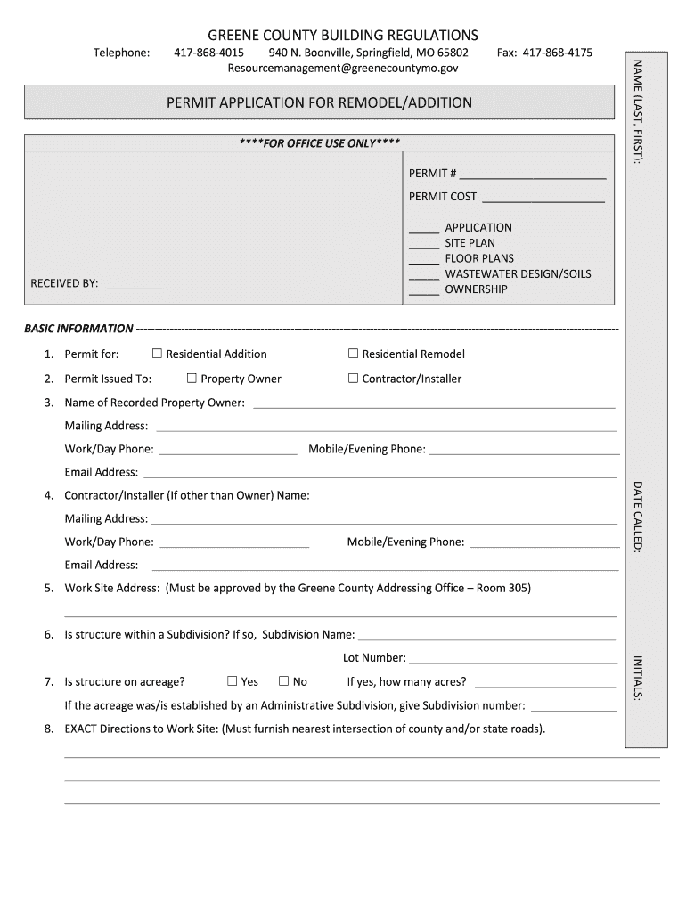 GREENE COUNTY BUILDING REGULATIONS 4178684015 940 N. Bonneville, Springfield, MO 65802 Resource management greenecountymo. Colfax: 4178684175PERMIT APPLICATION FOR REMODEL/ADDITION ****FOR OFFICE