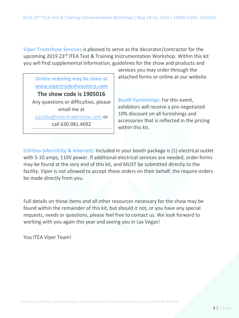 201923rdITEATest&TrainingInstrumentationWorkshop May1416,2019 SHOWCASE:1905016 ViperTradeshowServicesispleasedtoserveasthedecorator/contractorforthe upcoming201923rdITEATest&TrainingInstrumentationWorkshop.