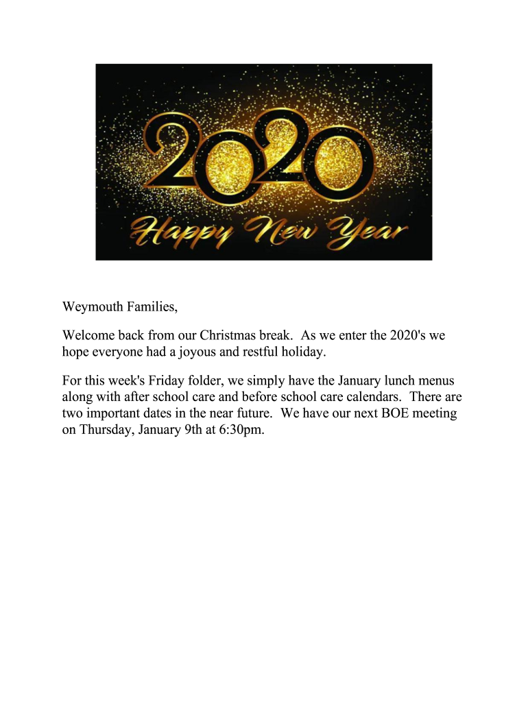 Weymouth Families, Welcome back from our Christmas break. As we enter the 2020s we hope everyone had a joyous and restful holiday. For this week's Friday folder, we simply have the January lunch menus