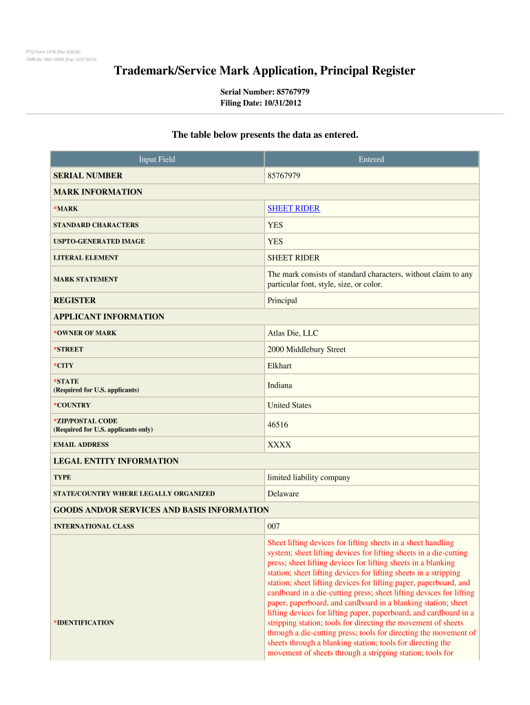 OMB No. 06510009 (Exp 12/31/2014)Trademark/Service Mark Application, Principal Register