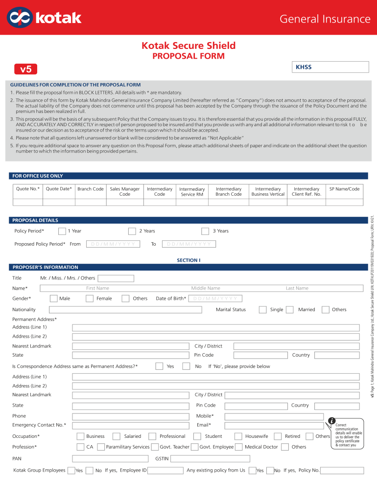 1. Please fill the proposal form in BLOCK LETTERS. All details with * are mandatory.2. The