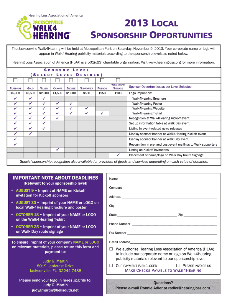 The Jacksonville Walk4Hearing will be held at Metropolitan Park on Saturday, November 9, 2013. Your corporate name or logo will